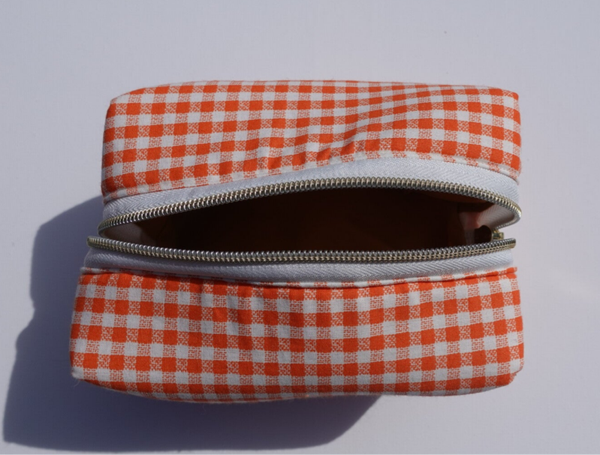 Trousse en tissu au motif vichy orange vous permettant de ranger vos produits de soin et de beauté, en voyage ou à la maison. Sa fermeture permet de garder vos objets bien protégés.