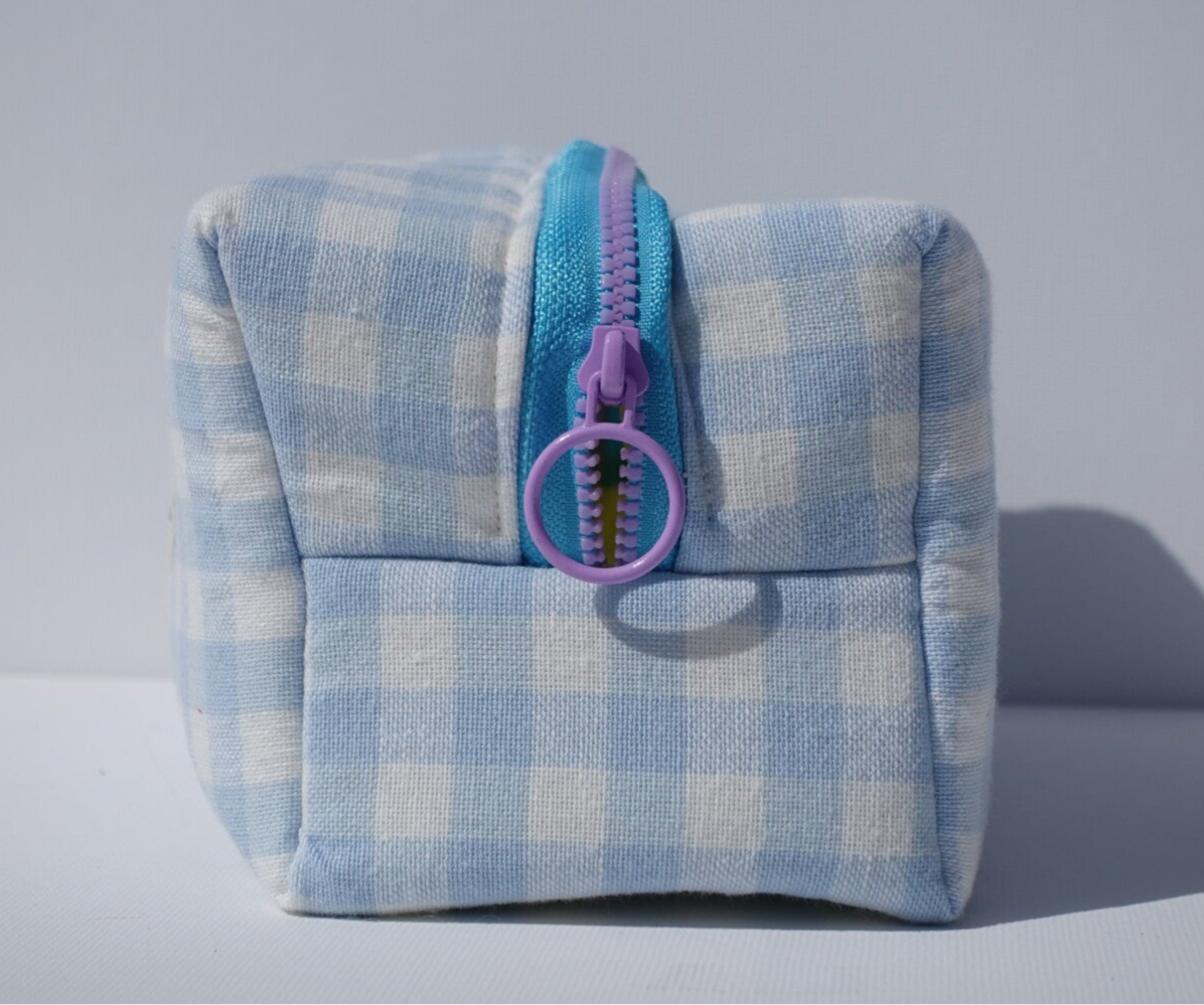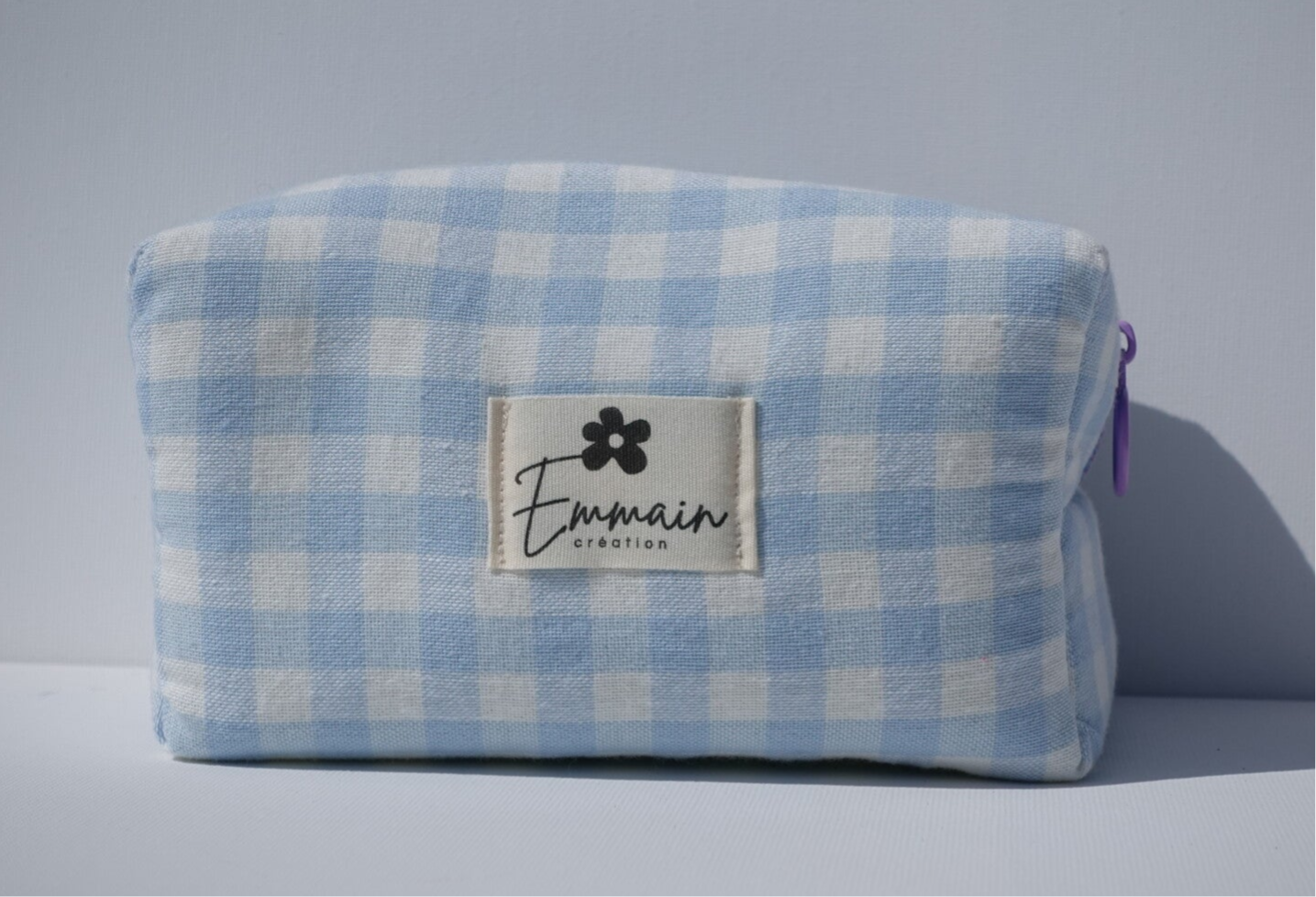 Trousse en tissu au motif vichy bleu vous permettant de ranger vos produits de soin et de beauté, en voyage ou à la maison. Sa fermeture permet de garder vos objets bien protégés.